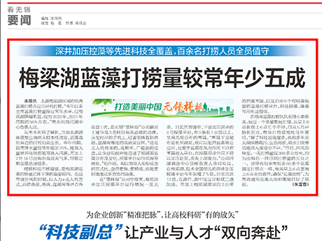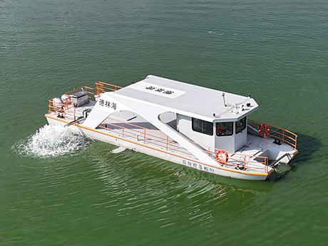 公司研發(fā)的加壓控藻船,以玻璃鋼船體為平臺,配置藍藻打撈、壓力控藻和曝氣裝置...